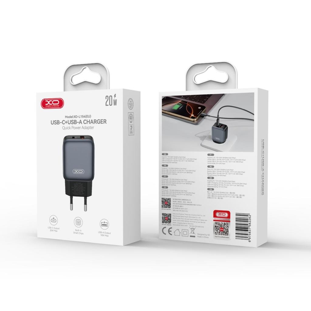Διπλός φορτιστής 220V XO L154. Διαθέτει πλήθος λειτουργιών γρήγορης φόρτισης, ώστε να φορτίζετε κάθε συσκευή σας τη μέγιστη δυνατή ταχύτητα, και δυνατότητα φόρτισης δύο συσκευών ταυτόχρονα. Παράλληλα διαθέτει προστασία από ηλεκτρικές βλάβες: υπερφόρτιση και βραχυκύκλωμα. Περιλαμβάνεται καλώδιο USB-C σε Lightning για να ξεκινήσετε την φόρτιση αμέσως μόλις βγάλετε τον φορτιστή από το κουτί.